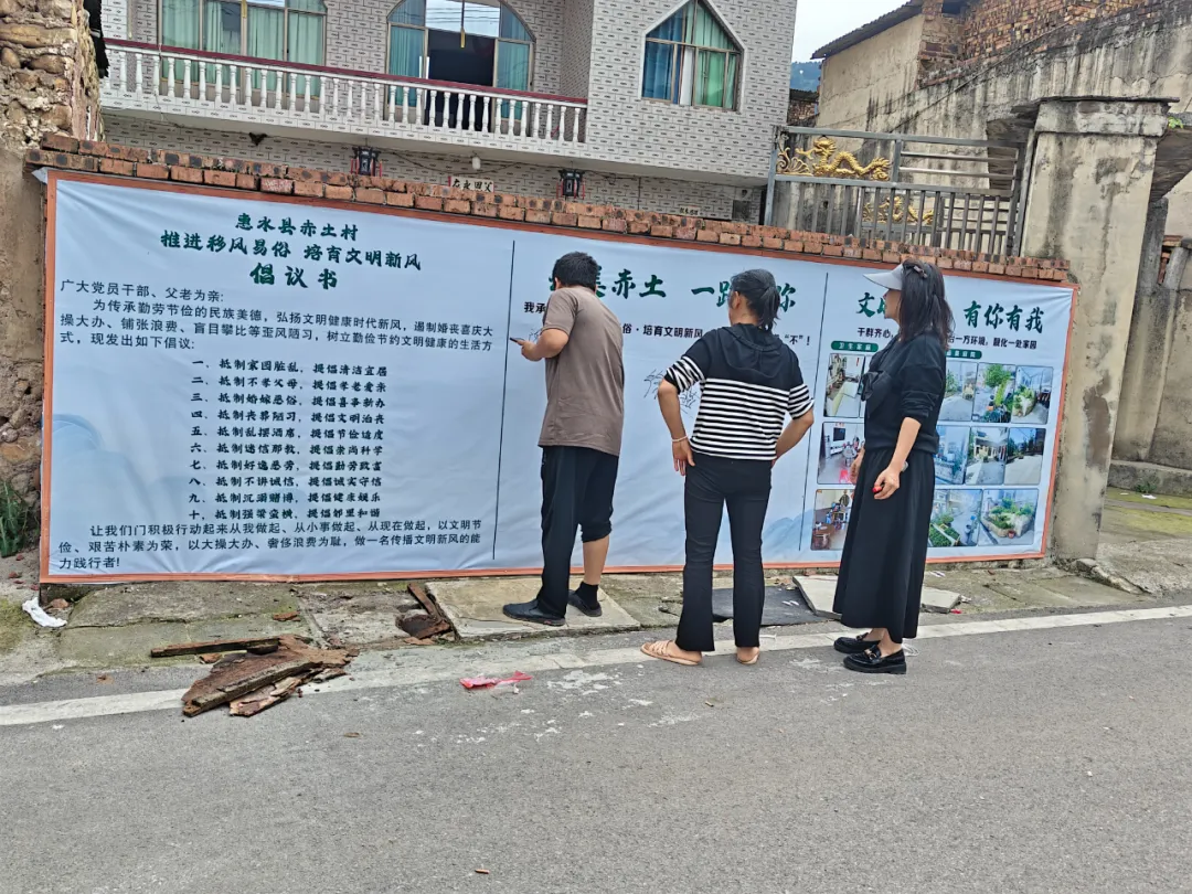 整风尚,润心子。赤土村结合地域文化,在1、2组打造示范样板,绘制移风易俗主题墙绘,设置家风家训牌,公开签订移风易俗承诺书,让“看得见的美”浸润村民生活,涵养文明气质。同时结合“积分制”激励群众参与,每月开展卫生评比活动,对积极参与环境治理的群众进行积分,兑换洗衣粉、洗洁精、等实用奖品,激发村民参与热情,让环境治理成为激发文明风尚的“活载体”。