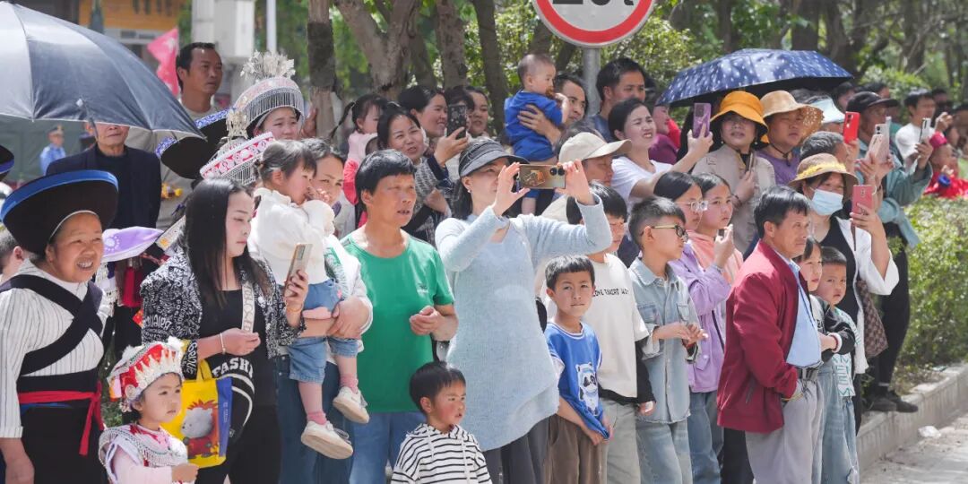 下午2点,道路两旁早早站满了远道而来的游客和村民。随着口号声响起,身着不同支系盛装的苗族同胞们从雕塑广场出发缓缓前行,绚丽夺目的银饰、做工精美的服饰迅速吸引了大家的目光。