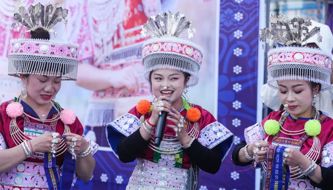 舞台上,背扇舞《苗寨“花园”里的那些事儿》通过情景剧展现苗族妇女制作背扇的情景,服装走秀《苗装叠影》则将现代T台与苗族同胞精美手工艺结合,仿佛在光影中讲述“古老与时尚的对话”。压轴的近千人的踩堂舞中,苗族同胞围成同心圆,跟随着芦笙节奏整齐舞动。