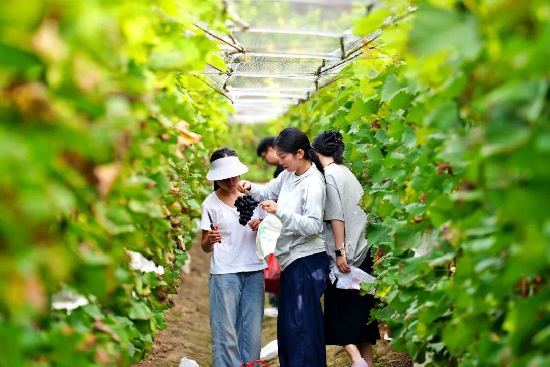 最受游客青睐的,当属入园采摘葡萄环节。走进连片的葡萄大棚,藤蔓间垂挂的串串葡萄晶莹剔透。游客们穿梭在藤蔓下,挑选、采摘、品尝一气呵成,大家纷纷拿出手机拍照,定格这份丰收的快乐。