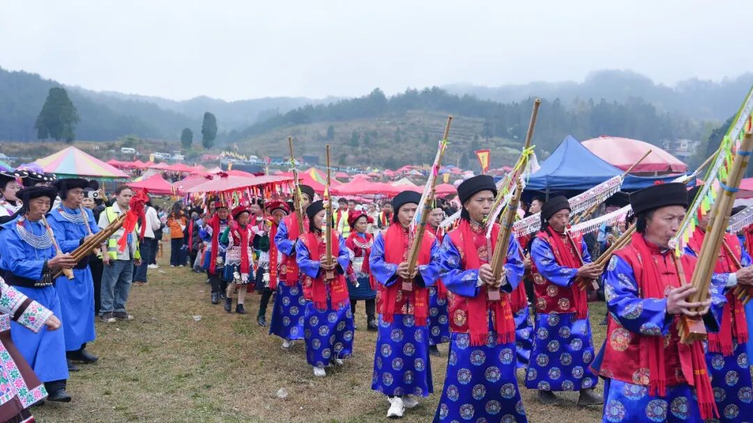 正午时分,雄浑木鼓擂响,悠扬大号齐鸣。水牛头、祭祀、苗鼓等队伍庄严行进,七个具有地方特色的方阵依次入场,九支木鼓红绸飞扬,老中青三代芦笙手银饰闪耀。孩童紧随其后,文脉赓续、代代相传。寨老一声深情呼唤,全场同声应和,民族记忆在共鸣中扎根心田,家国情怀在相聚里升温。