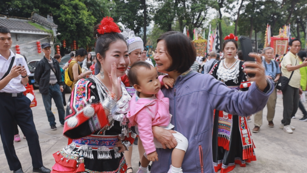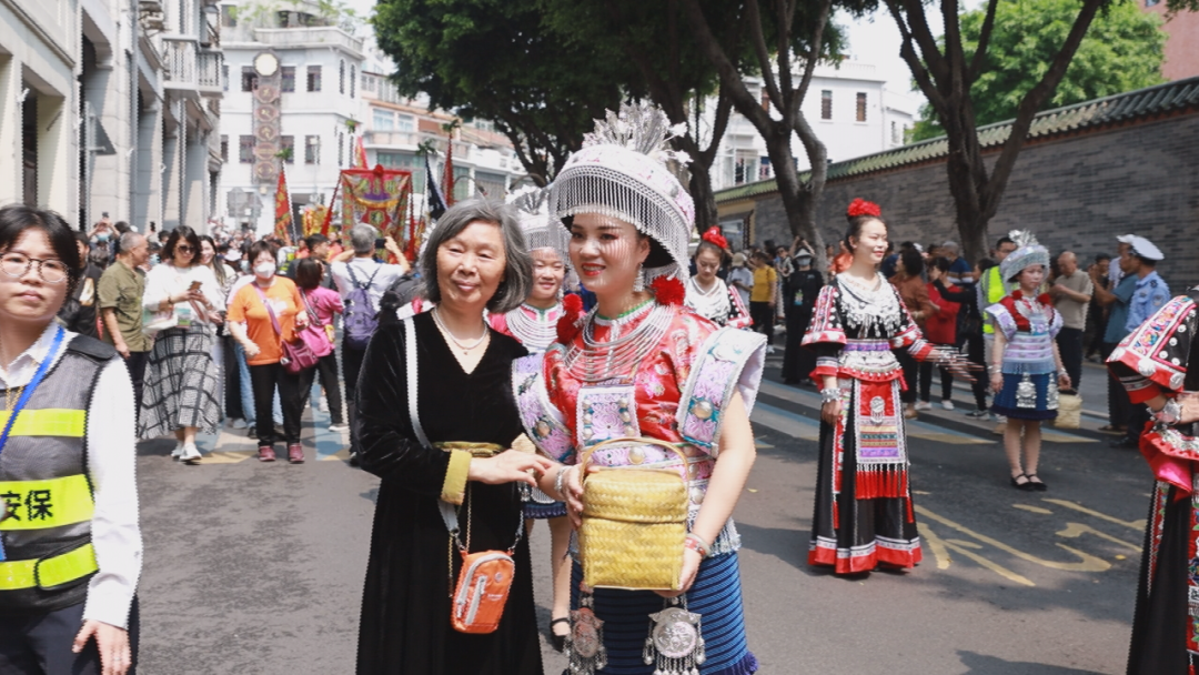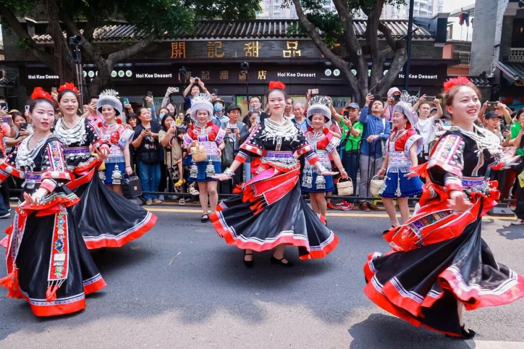 大型民俗文化巡游是今年荔湾区“三月三”活动的重头戏。活动中,惠水苗族姑娘身着节日盛装,融入巡游方阵中。她们跳着欢快的舞蹈,尽情展示惠水苗族民俗文化特色,为广州市民、游客献上一场精彩纷呈、互动性强的民俗特色展演。