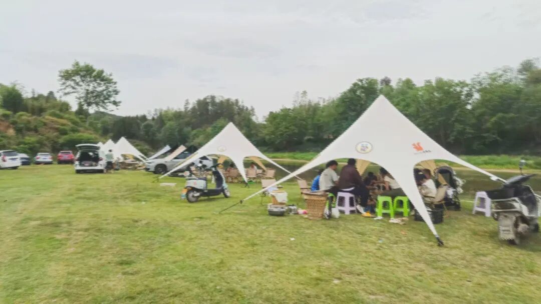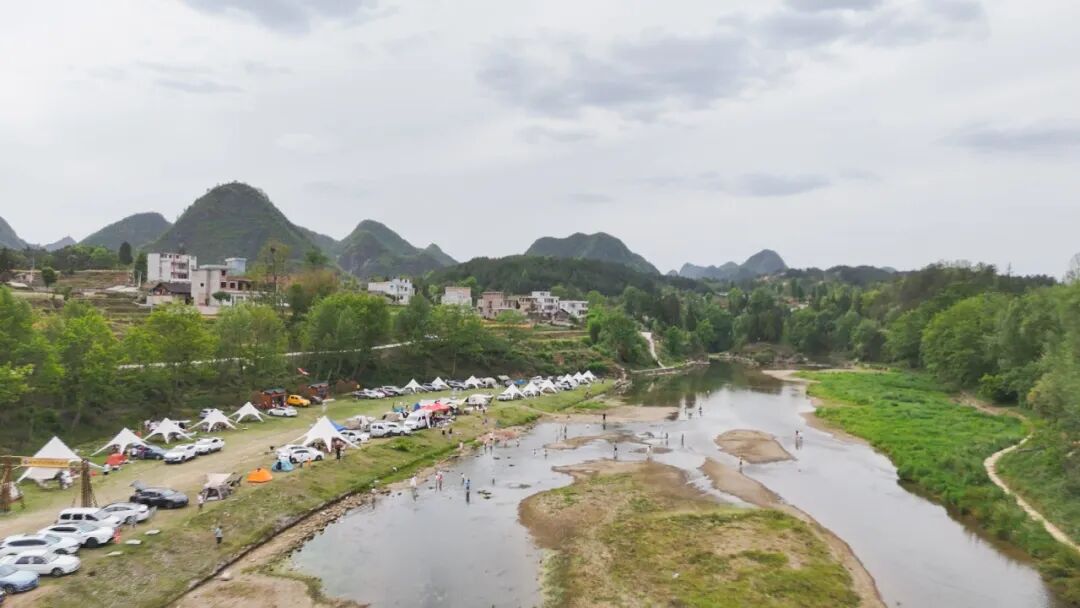 在惠水县断杉镇董朗村恋水湾露营基地,各式各样的帐篷星罗棋布,来自省内外的自驾游和露营爱好者们围坐在小桌旁烧烤、聊天、赏景,孩子们则在浅水区嬉笑玩耍,处处洋溢着欢乐的氛围,构成了一幅温馨美好的假日生活图景。