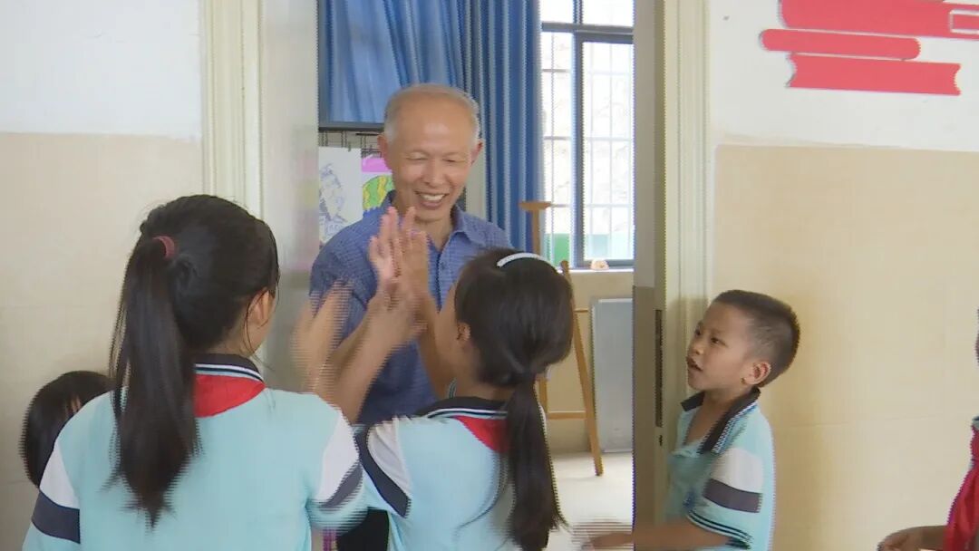 “方爷爷,方爷爷!”在惠水县明田街道惠民小学的教学楼走廊上,清脆的呼喊声此起彼伏。头发花白精神矍铄的方萍刚走进校园,就被孩子们团团围住,有的伸手要击掌,有的凑过来求拥抱,热闹的场景成了校园里每天上演的温暖画面。