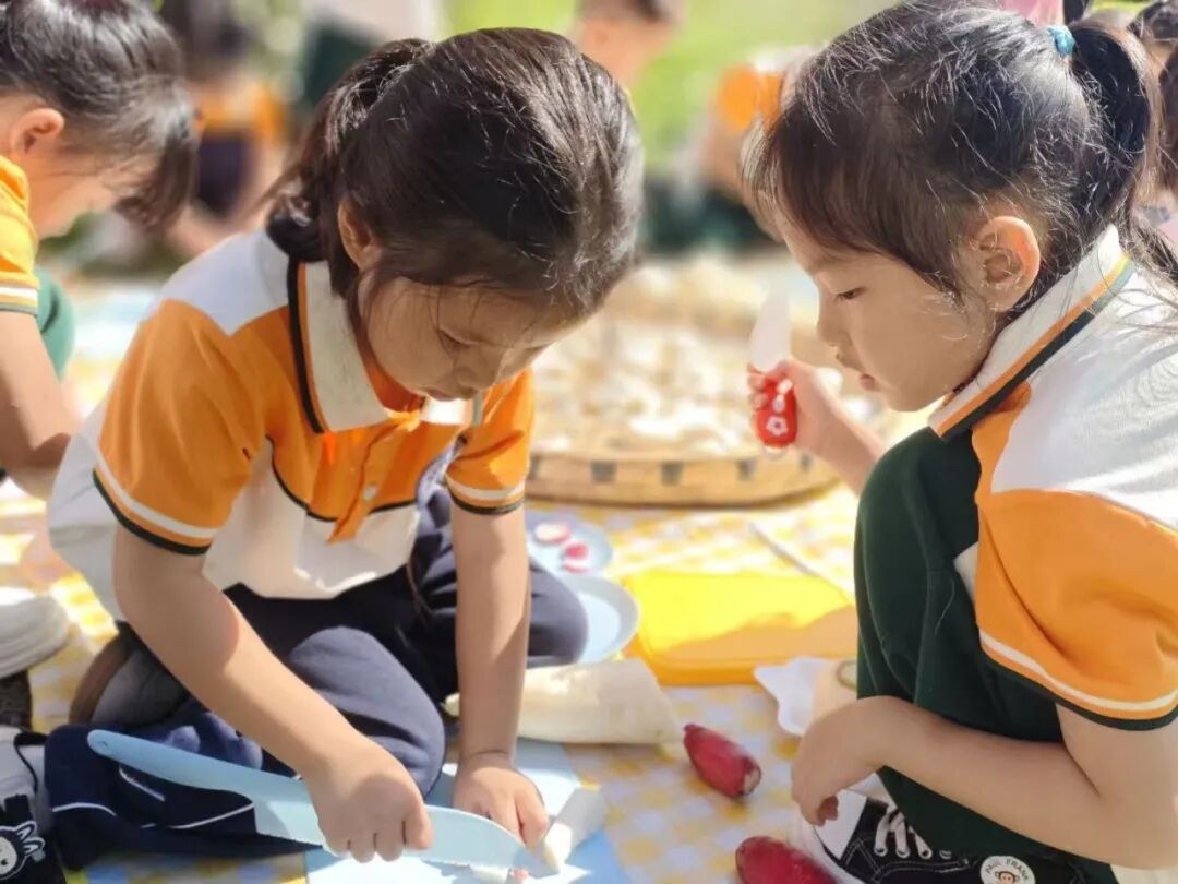 活动前,幼儿园提前制定方案,排查安全隐患,筹备物资,确保活动安全有序。当天,孩子们在老师、家长的护送下,徒步抵达公园,投入“秋实趣晒”主题创作。小班用橘子和花生拼出“‘橘’祥如意”“好事花生”等图案;中班以豇豆、红薯编织秋日画面;大班则晾晒玉米、萝卜,呈现丰收场景。孩子们动手协作,欢声不断。