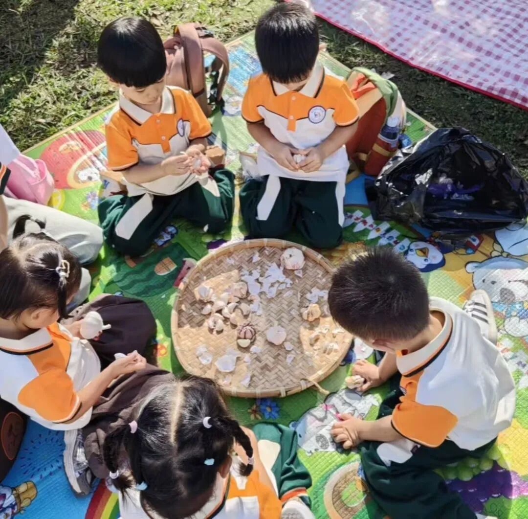活动最后,全体师幼在作品前合影留念。茶歇时,孩子们分享点心,自觉维护环境卫生。此次研学将课堂延伸至自然,让孩子们在多感官体验中认识秋天、感受劳动,提升了观察与协作能力,也在心中播下热爱传统文化的种子。