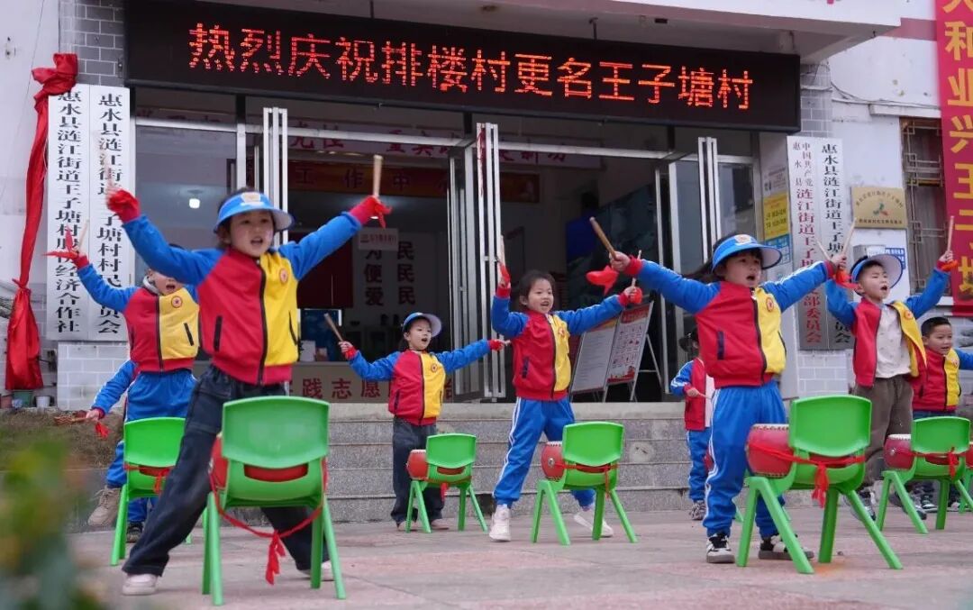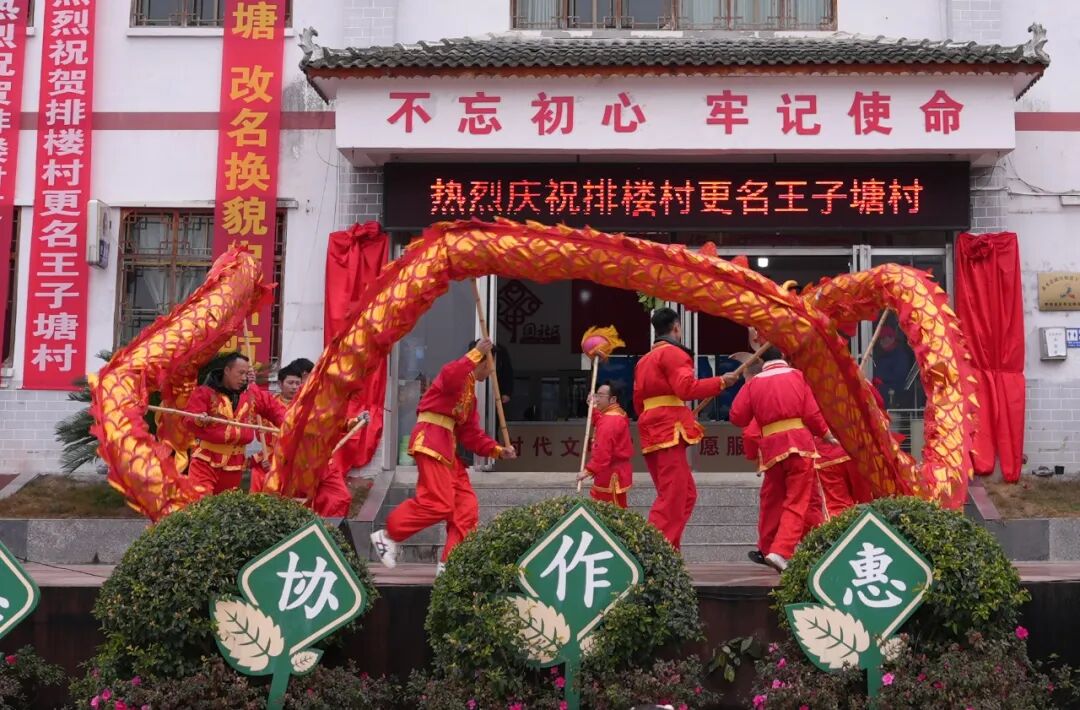 热闹的舞狮拉开更名仪式的帷幕,村民及小朋友为大家带来了精彩的歌舞表演,增添了喜庆的氛围。随后,进行了新地名标志牌的揭牌仪式,标志着排楼村正式更名为王子塘村。